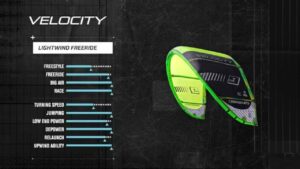 The Velocity has a reputation as an efficient race kite with a bow shape that gives you plenty of juice and lots of hang time. The shape is derived from that of the older Cabrinha crossbow and has been fine tuned with less diamater in the struts and LE. Ideal, for bigger riders and those who like to have plenty of power matched with stability, the Velocity is good for the “Freerider”. If you like to enjoy the view from the top with big boosts and glide accross the water with max control under power, then this is the kite you’ve dreamed of. The Velocity is also excellent for the hydrofoil due to its efficiency.