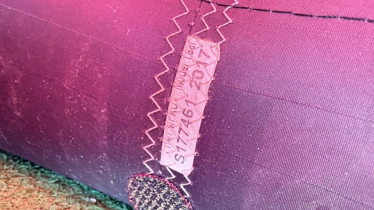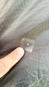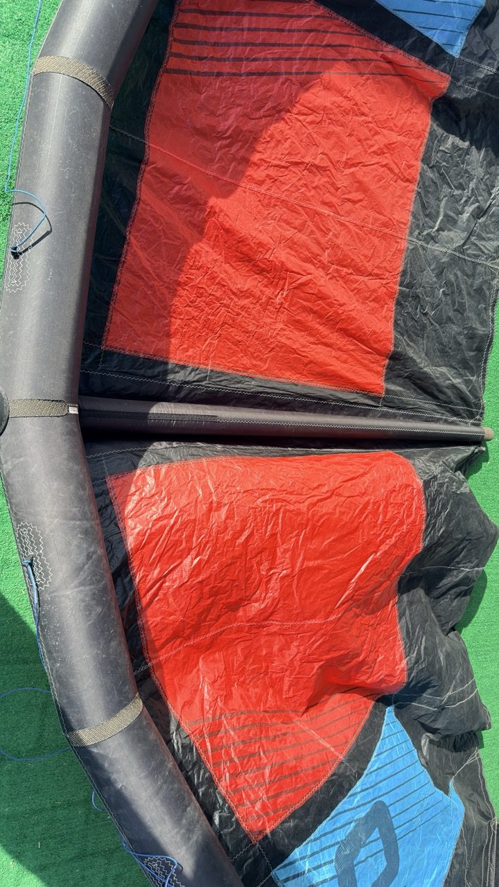 Kite is in really good shape. Material is still crispy. Pumped up and held air with no problem for over an hour. One small pin hole patched with tear aid as pictured. The bag has some holes in it as well. Good Deal for a powerful kite!!