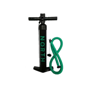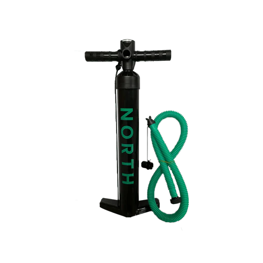 Double or single action inflation to 21 PSI Multiple adaptors for board and wing use Integrated Shockproof Pressure Gauge Safety leash for wing High quality seals and anti-sand filter.